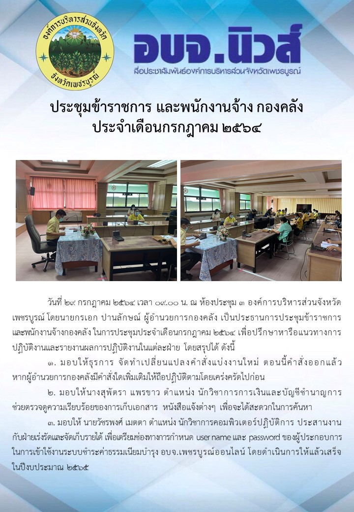 รายงานการประชุมประจำเดือนกรกฎาคม 2564 เผยแพร่เมื่อ: 30 กรกฎาคม 2564 รายงานการประชุมกองคลัง ประจำเดือนกรกฎาคม 2564 หมวด: รายงานการประชุม